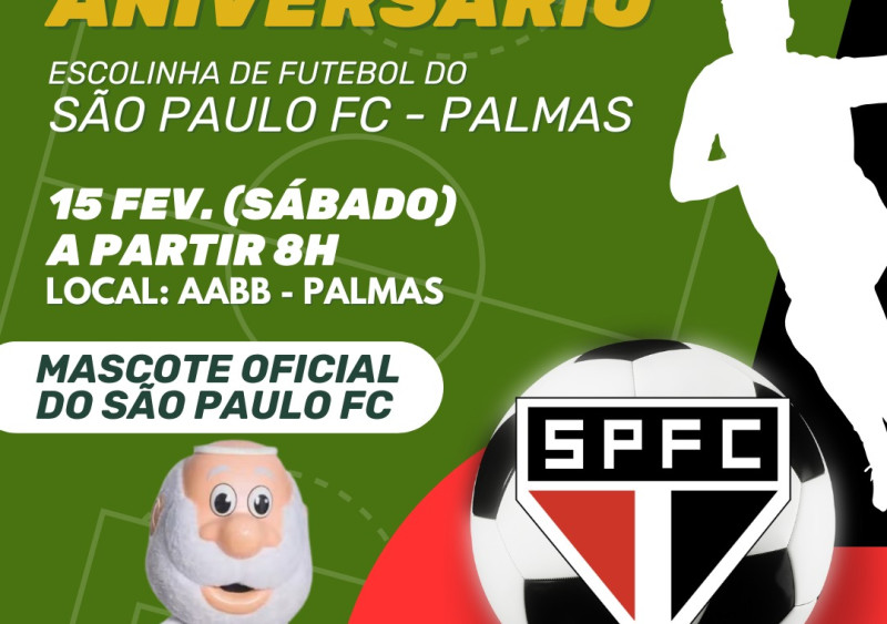 A Escola Oficial do São Paulo Futebol Clube comemora, neste sábado, dia 15 de fevereiro, a partir das 8h, na AABB Palmas, seu 5º aniversário. A inauguração oficial aconteceu em 8 de fevereiro de 2020, mas a direção da escola optou por realizar a celebração uma semana depois para garantir uma programação ainda mais especial para alunos, pais e parceiros.