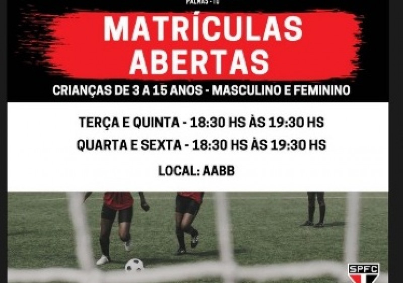 A Escola Oficial do São Paulo Futebol Clube, na AABB Palmas, segue com as matrículas abertas para o Babyfoot (crianças de 3 a 5 anos), além de 6 a 15 anos. As aulas são realizadas das 18h30 às 19h30, nas terças e quintas, e nas quartas e sextas.