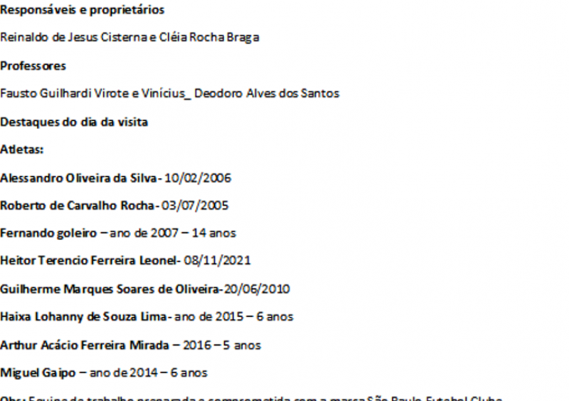 Obs: Equipe de trabalho preparada e comprometida com a marca São Paulo Futebol Clube. Ambiente de trabalho bem organizado e limpo. Horários e disciplina levados a sérios pelos alunos. Dependências da AABB de Palmas TO em perfeito estado para a pratica do futebol. Enfim, tudo correu dentro dos controles da Covid 19, medição de temperatura, álcool gel e hidratação. Escola que só engrandece as duas Instituições, AABB de Palmas e São Paulo Futebol Clube.