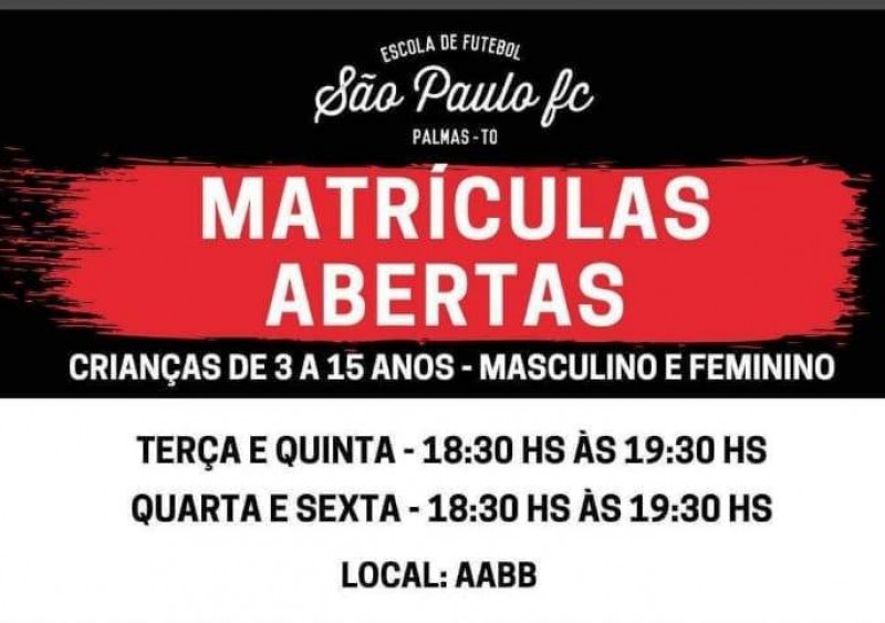 A Escola do São Paulo Futebol, sediado nas dependências da AABB Palmas, comunica aos pais, alunos e responsáveis que os treinamentos da escola retornam nesta terça-feira, dia 3 de janeiro, às 18h30, conforme dias de cada categoria. Acesso site WWW.spfcpalmas.com.br